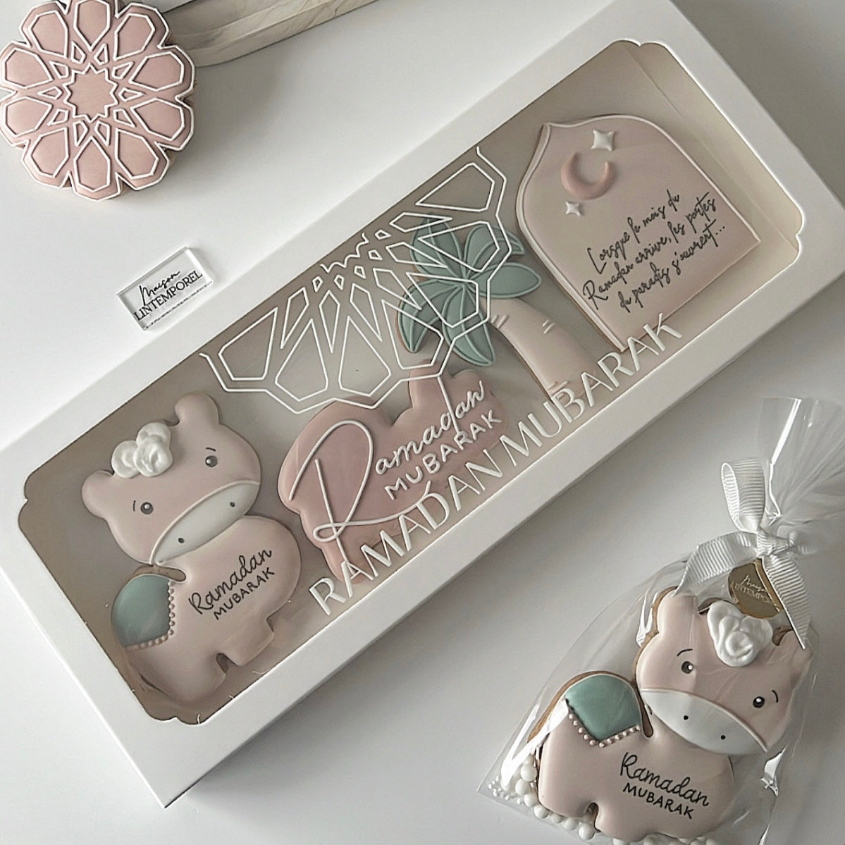 Ce coffret réunit quatre sablés décorés de 8cm, évoquant l'esprit du Ramadan: le dromadaire, le palmier, le sablé "Ramadan Mubarak" et l'arche annonçant l'arrivée de ce mois de Recueillement. Une composition douce et raffinée, pensée pour accompagner les premiers jours du Ramadan.