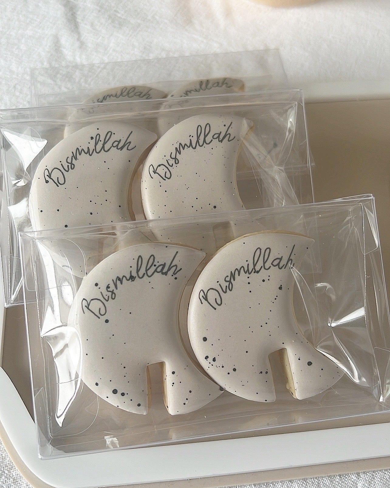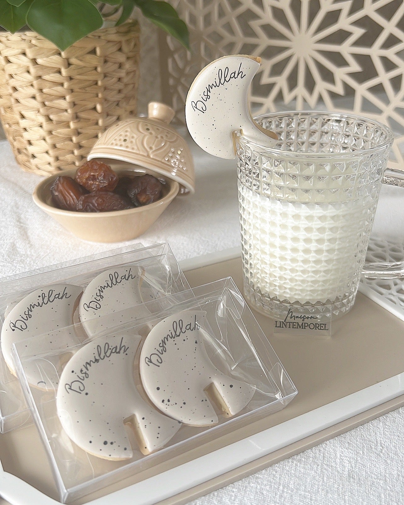 En forme de lune avec l'inscription "Bismillah", ces minis sablés s'accrochent au rebord de la tasse pour accompagner vos thés et cafés lors de l'Ifatr.