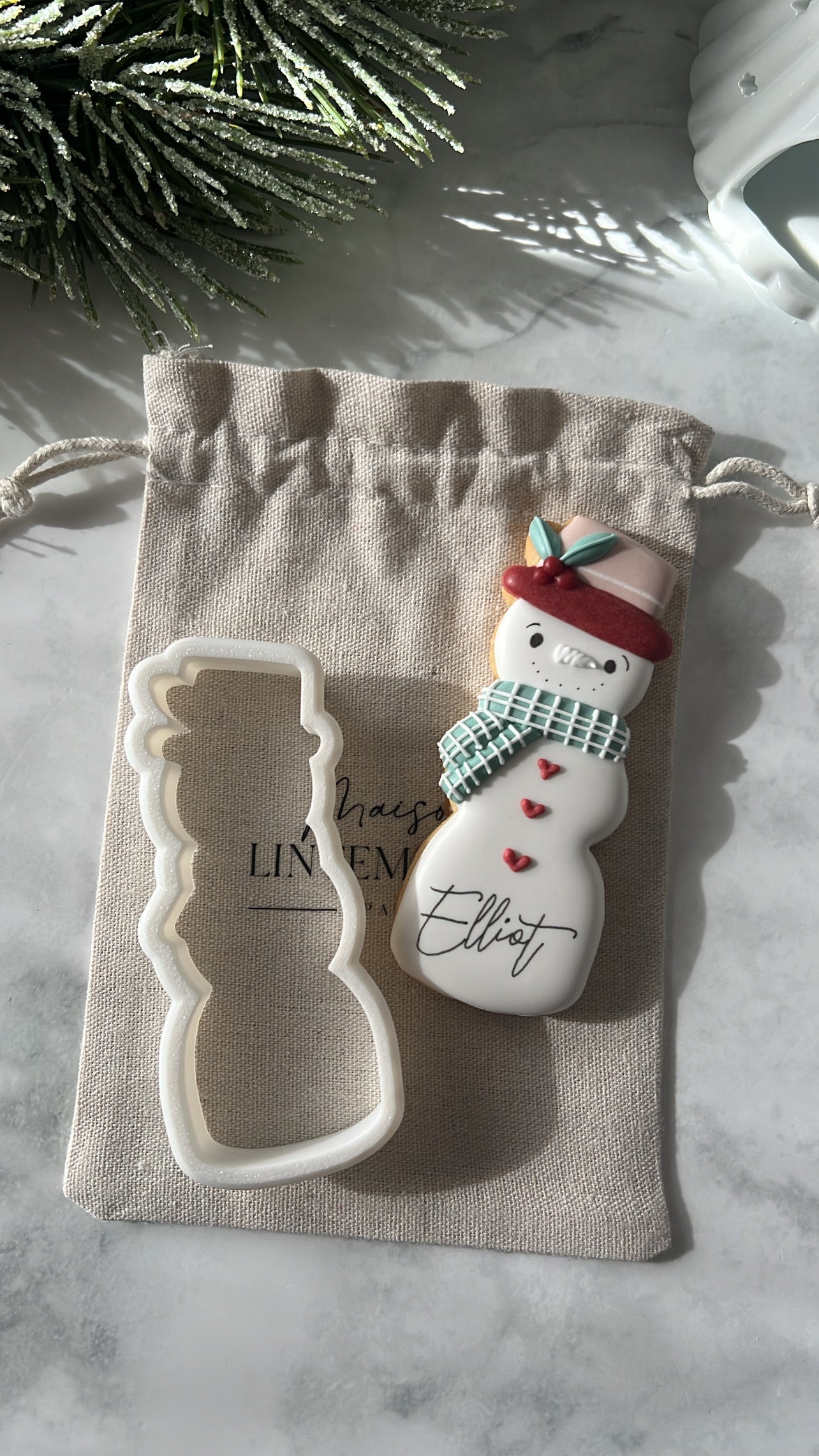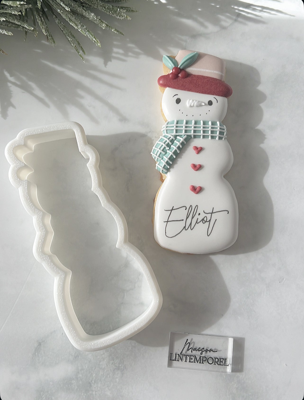 Emporte-pièce bonhomme de neige de 10cm, spécialement conçu avec un corps allongé pour y inscrire le prénom d'un enfant ou un petit mot doux.